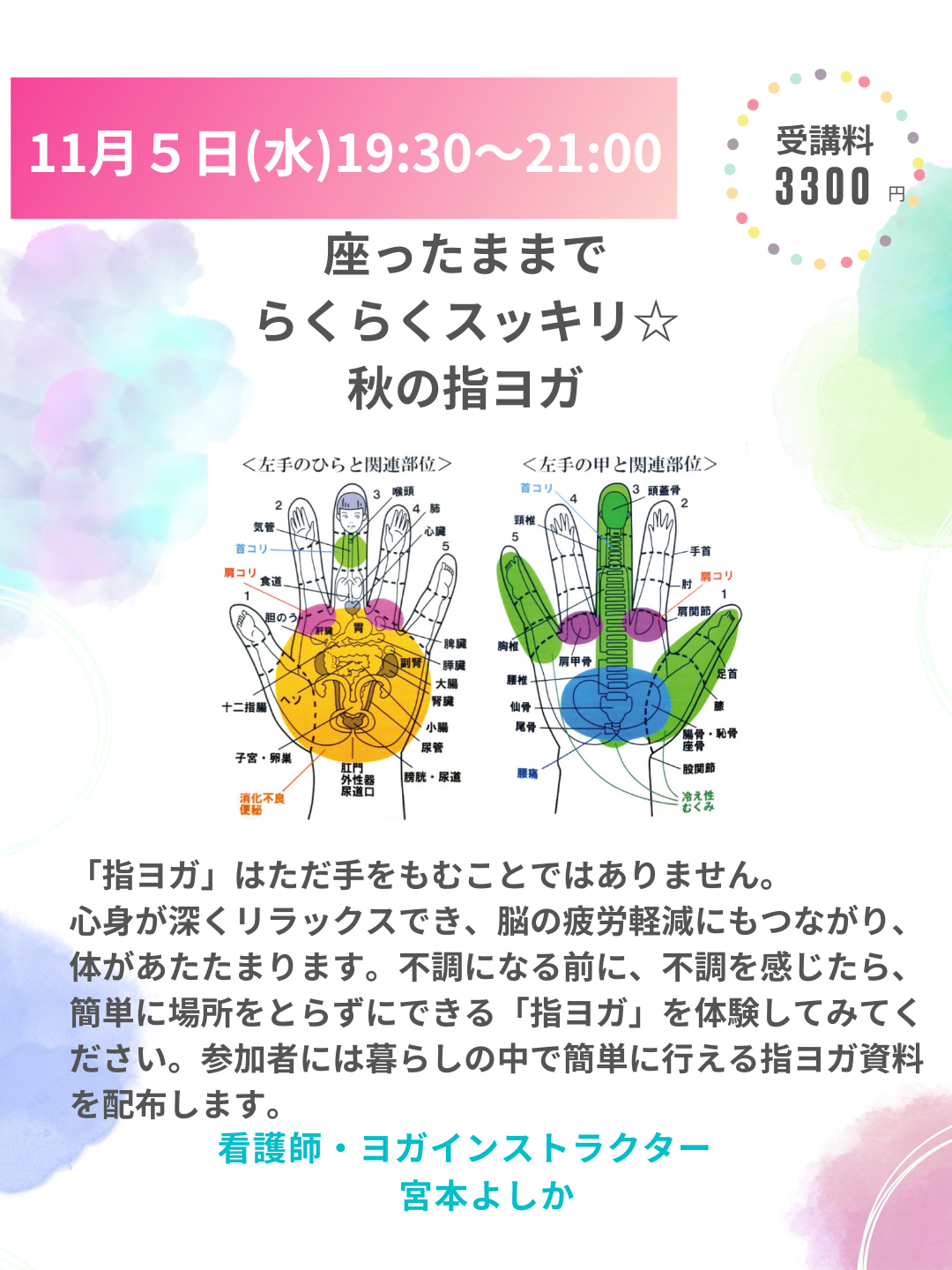 「指ヨガ」はただ手をもむことではありません。 心身が深くリラックスでき、脳の疲労軽減にもつながり、 体があたたまります。 不調になる前に、不調を感じたら、 簡単に場所をとらずにできる「指ヨガ」を体験してみてください。 参加者は暮らしの中で簡単に行える指ヨガ資料もお持ち帰りいただけます。 手軽に秋の心身を整えませんか? お待ちしております。